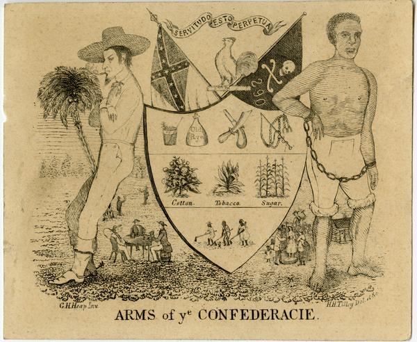 Civil War print using the allegory of a coat of arms to criticize slavery and Southern culture. Depicts the shield adorned