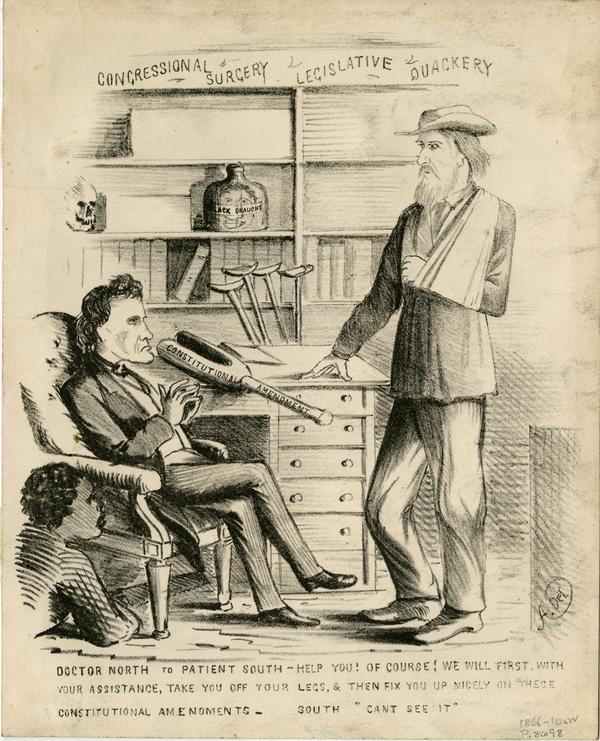 Cartoon addressing the defeated South's resistance to the pending post war amendments which would declare equal rights for African Americans. Depicts a doctor's office where the seated "Dr. North" counsels "Patient South," who stands before him with his arm in a sling. He proposes that after the removal of the South's legs the "Constitutional Amendment" peg leg, which rests on his desk, will support him well. The South states that he "Can't See it." In the left, a young African American person crouches on the floor beside the doctor's chair. Behind the desk stands a bookshelf labeled "Congressional Surgery, Legislative Quackery" where a skull and a bottle of "Black Draught" are displayed. Contains three lines of dialogue below the image.