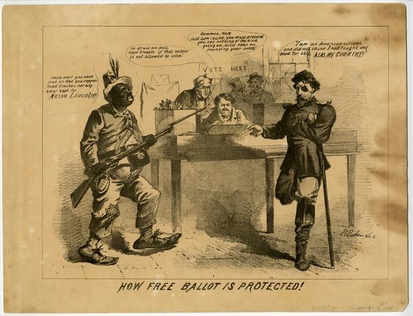 prevents a disabled white Union soldier from voting for McClellan. In the left, the African American man holds a bayoneted