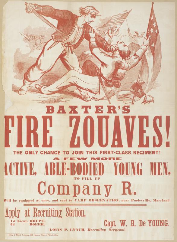 Baxter's Fire Zouaves! The only chance to join this first-class regiment! : A few more active, able-bodied young men, to fill up Company R. Will be equipped at once, and sent to Camp Observation, near Poolesville, Maryland. Apply at recruiting station, 1st Lieut. Houpt, 2d " Doerr. Capt. W.R. De Young. Louis P. Lynch, recruiting sergeant.