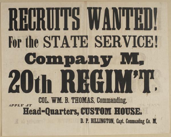 Recruits wanted! For the state service! : Company M, 20th Regim't, Col. Wm. B. Thomas, commanding. Apply at head-quarters, Custom House. / D.P. Billington, Capt. commanding Co. M,