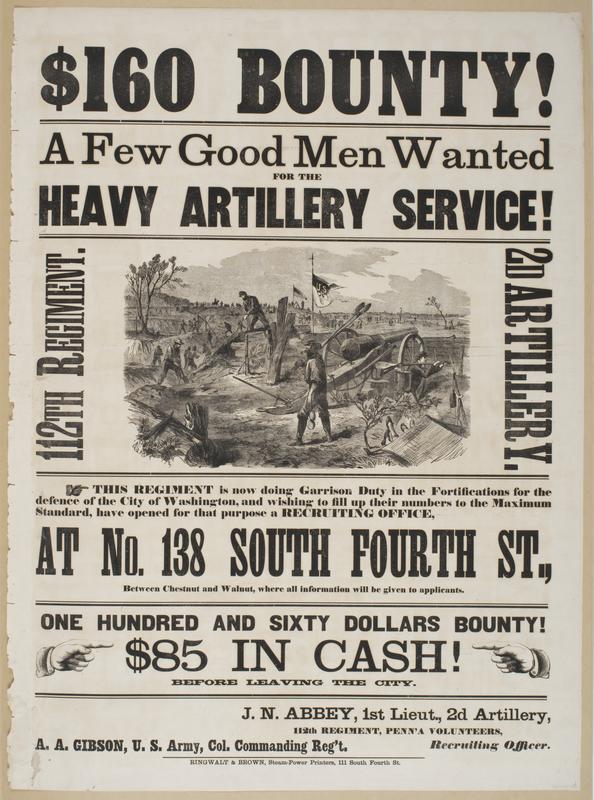 $160 bounty! A few good men wanted for the heavy artillery service! : 112th Regiment. 2d Artillery. This regiment is now doing garrison duty in the fortifications for the defence of the city of Washington, and wishing to fill up their numbers to the maximum standard, have opened for that purpose a recruiting office, at No. 138 South Fourth St., between Chestnut and Walnut, where all information will be given to applicants. One hundred and sixty dollars bounty! $85 in cash! Before leaving the city. J.N. Abbey, 1st Lieut., 2d Artillery, 112th Regiment, Penn'a Volunteers, recruiting officer. A.A. Gibson, U.S. Army, Col. commanding reg't.
