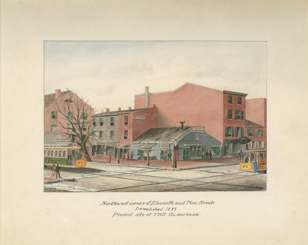 Northwest corner of Eleventh and Pine Streets. Demolished 1889. Present site of the Gladstone. [graphic] / B.R. Evans. |