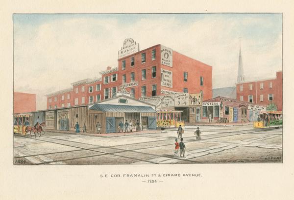 Depicts businesses at the southeast corner of Franklin Street and Girard Avenue including A. L. Flue, Excelsior Range, heaters and ranges (710 Girard Avenue); A. W. Paulsworth Flour (712 Girard Avenue); Goodenough & Seeley, horseshoer and Thomas Miller, horseshoer (714 Girard Avenue) and Robert Lehman's oyster house (716 Girard Avenue). Also includes a market shed in the middle of Girard Avenue and pedestrian and street traffic including two trolleys and a horsecar.