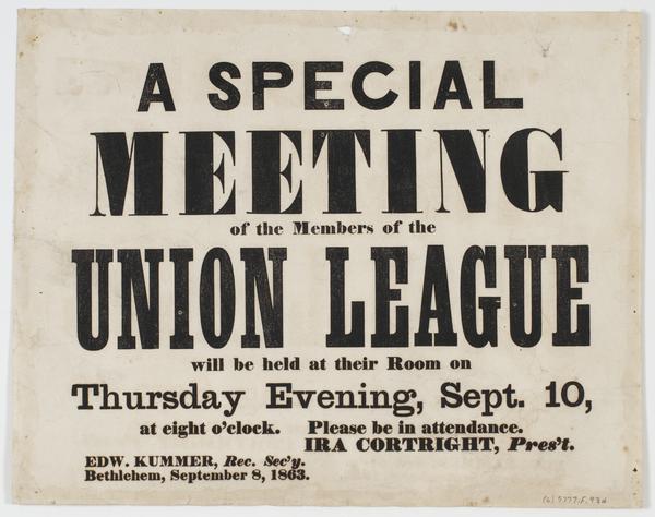 A special meeting of the members of the Union League : will be held at their room on Thursday evening, Sept. 10, at eight o'clock. Please be in attendance. / Ira Cortright, pres't. Edw. Kummer, rec. sec'y. Bethlehem, September 8, 1863.