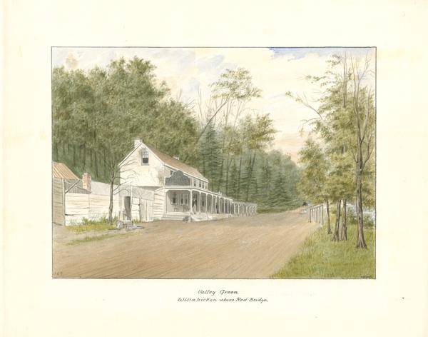 Depicts the I. D. Casselberry Valley Green Hotel, probably the last surviving Wissahickon roadhouse, surrounded by trees in Wissahickon Park above Red Bridge built in 1851. Also includes Wissahickon Creek (right), a passenger coach and two people standing on the porch of the hotel.
