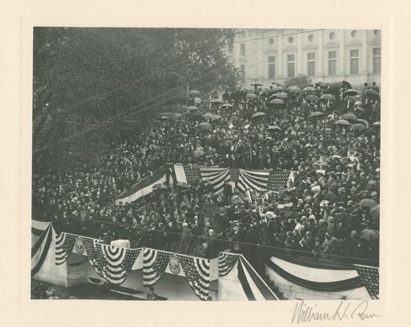 Depicts a large group of people in elevated stands adorned with patriotic bunting in front of the Capitol building. The band is standing and playing "My Country, 'Tis of Thee" before the large crowd of spectators during the Capitol dedication ceremony.