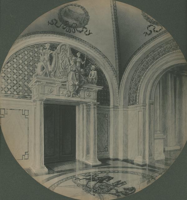 Photographic reproduction of an architectural drawing by Joseph M. Huston showing details of sculptures over door, arches, and floor design with horses and state seal in the entrance hall of the Capitol building. Huston was commissioned to design the structure, constructed between 1902 and 1906 to house the Pennsylvania General Assembly, the chambers of the Sumpreme Court of Pennsylvania, and the offices of the Governor.