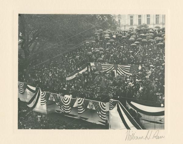 View looking down at the crowded grandstand in front of the Capitol building as former Governor William A. Stone hands Governor Samuel W. Pennypacker the gold key of the Capitol.