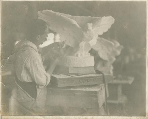 Depicts a marble worker carving an eagle that will be placed on top of the sculptured cherub-globe ornament over the entresol door in the Rotunda. Designed and sculpted by Vincenzo Alfano, who could very well be the man depicted in the photograph.