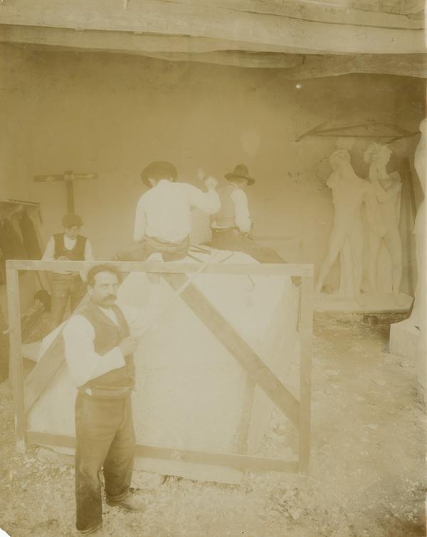 Depicts four workers chiseling a large slab of marble in the Piccirilli Brothers workshop in New York City, starting the rough carving of a sculpture designed by George Grey Barnard for the front entrance of the Pennsylvania State Capitol building. The Piccirilli Brothers not only completed the rough carving of the 27 statues designed by George Grey Barnard, they also installed them in 1911. In the background, two carved male figures hold hands, one man grasps his cheek with his head thrown back and the other cups his hand to his lips, as if he's whispering to the other figure. This pair stands at the front of the south statuary group, "The Burden of Life: The Broken Law".