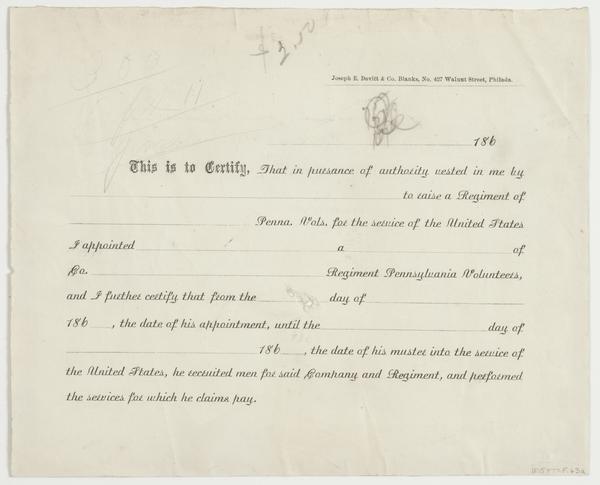 This is to certify, : that in pursance [sic] of authority vested in me by [blank] to raise a regiment of [blank] Penna. Vols. for the service of the United States I appointed [blank] a [blank] of Co. [blank] Regiment Pennsylvania Volunteers, and I further certify that from the [blank] day of [blank] 186[blank], the date of his muster into the service of the United States, he recruited men for said company and regiment, and performed the services for which he claims pay.
