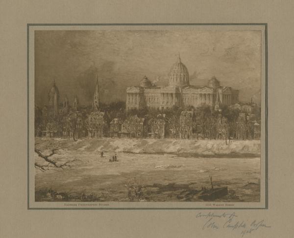 Photograph of a Colin Campbell Cooper painting of a winter scene showing the Capitol building in the distance. Taken from