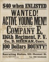 $40 when enlisted Wanted! Active young men to fill up Company E, 116th Regiment, P.V. : Col. D. Heenan, com'g. 100 dollars bounty! One month's pay in advance; men mustered in and pay and rations to commence immediately. Recruiting station, 531 Chesnut St. / Capt. John McNamarer First Lieut. Joseph Miles. Second Lieut. Geo. W. Williams.