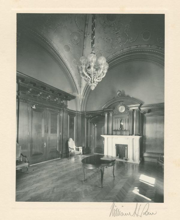 Interior view of first floor reception room in the Capitol building, looking toward fireplace surmounted by large clock and chandelier.