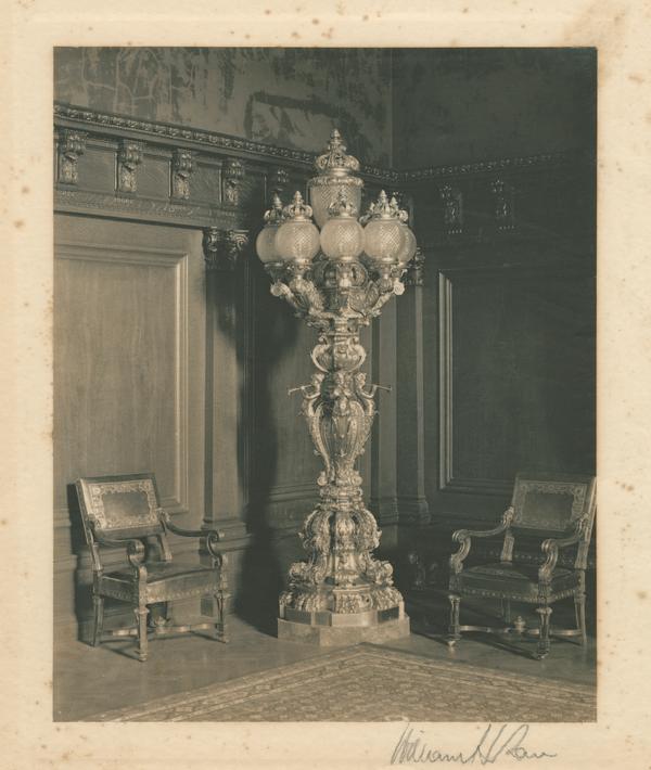 View of a bronze ornamental floor lamp with one tier of globes surmounted by one large, bronze-capped globe in the corner of the Executive Reception Room. Three cherubs playing horns are carved into the post below the globes. Similarly designed standard lamps were used throughout the Capitol building, contructed from 1902 to 1906 after designs by Joseph M. Huston.