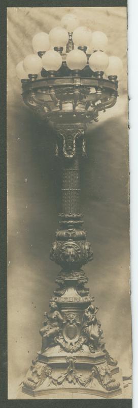 Bronze ornamental floor lamp surmounted by three tiers of globes and weighing 1900 lbs. Similarly designed standard lamps were used throughout the Capitol building, contructed from 1902 to 1906 after designs by Joseph M. Huston.