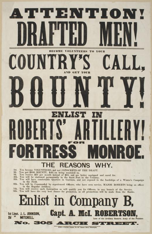 Attention! Drafted men! : Become volunteers to your country's call and get your bounty! Enlist in Roberts' Artillery! For Fortress Monroe. The reasons why. 1st. You become volunteers, and not conscripts of the draft. 2d. You get $100 bounty, $40 on being mustered in. 3d. You receive $13 per month instead of $10, and are better equiped and cared for. 4th. You will be stationed permanently in the finest fort in the country. 5th. You will have comfortable quarters in garrison, and not exposed to the hardships of a winter's campaign in the field. 6th. You will be commanded by experienced officers, who have seen service, Major Roberts being an officer in the regular artillery. 7th. You will receive such instruction as will qualify you for officers, in any branch of the service. 8th. You will have the very best chance for promotion, as all promotions will be made from the ranks. / Enlist in Company B., Capt. A. McI. Robertson, late of the Artillery Reserve, Army of the Potomac. 1st Lieut. J.L. Johnson, 2d " Mitchell. No. 305 Arch Street.