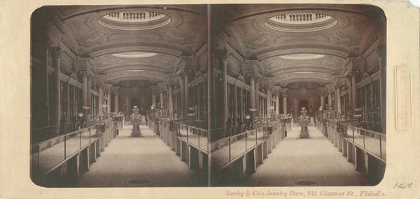 Interior view of the silverware and jewelry manufacturer established in 1832 as Bailey, Kitchen & Co. Shows displays cases