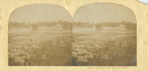 the mill house, the stand pipe (built 1852), and the pavilion at the end of the pier of the mound dam. Also shows the Schuylkill