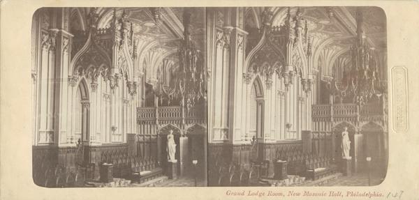 Interior of the Masonic Hall built 1853-1855 after the designs of Sloan & Stewart at 713-721 Chestnut Street. Shows the north wall of the Grand Lodge Room constructed after the designs of Collins & Autenrieth. Includes statuary, carpeting, a chandelier, pews, and ornately decorated architectural elements. Hall razed by fire in 1886.