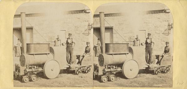 View of small coal powered steam locomotive in front of a stone building with three men.