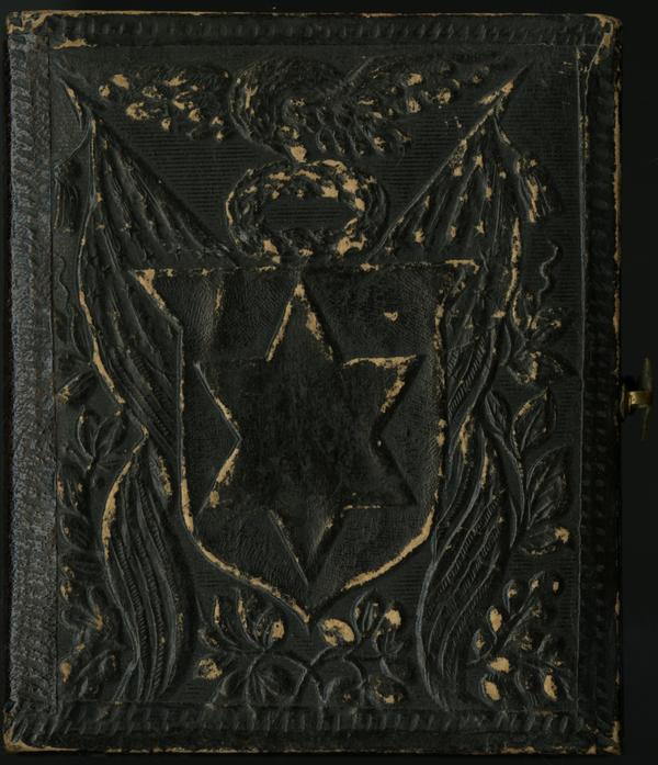 Case: Leather. Geometric design featuring a six-pointed star within a shield flanked by banners. Same design on verso. |