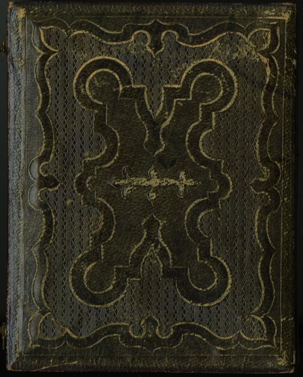 Case: Leather. A large floral spray with a lily and leaves, surrounded by an ornate scrolled border. Geometric design on verso. |