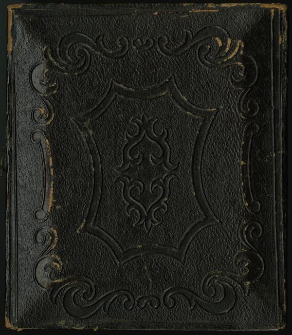 Case: Leather. Design is curved octagon within scroll and is Plate 219 in Floyd and Marion Rinhart's American miniature case