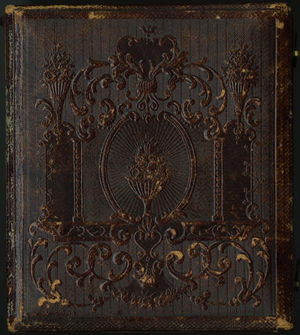 Case: Leather. Case design showing small vase of flowers in the center surrounded by ornate decorations is called "Flower