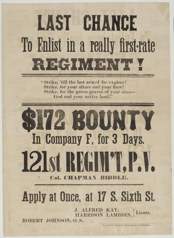 Last chance to enlist in a really first-rate regiment! : "Strike, 'till the last armed foe expires! Strike, for your altars and your fires! Strike, for the green graves of your sires--- God and your native land!" $172 bounty in Company F, for 3 days. 121st Regim't, P.V. Col. Chapman Biddle. Apply at once, at 17 S. Sixth St. / J. Alfred Kay, Harrison Lambdin, Lieuts. Robert Johnson, O.S.