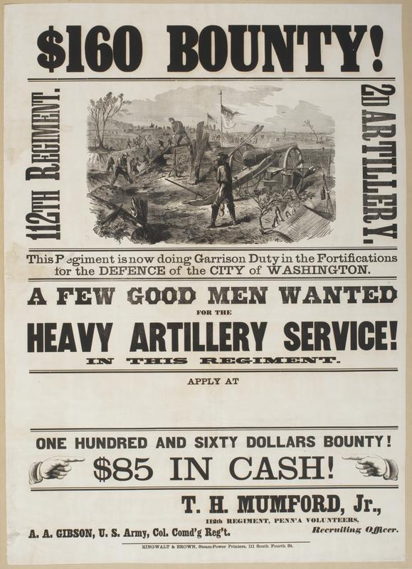 $160 bounty! 112th Regiment. 2d Artillery. : This regiment is now doing garrison duty in the fortifications for the defence of the city of Washington. A few good men wanted for the heavy artillery service! In this regiment. Apply at [blank] One hundred and sixty dollars bounty! $85 in cash! T.H. Mumford, Jr., 112th Regiment, Penn'a Volunteers, recruiting officer. A.A. Gibson, U.S. Army, Col. comd'g reg't.