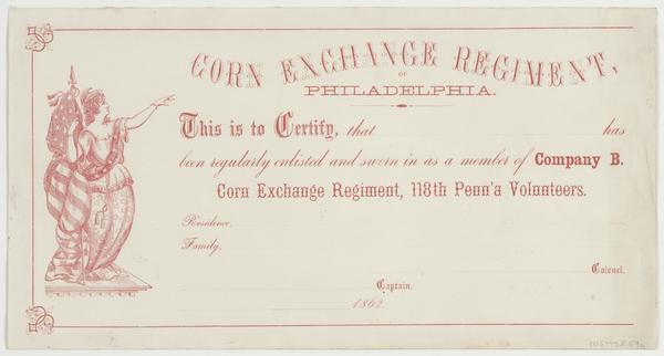 Corn Exchange Regiment, of Philadelphia. : This it to certify, that [blank] has been regularly enlisted and sworn in as a member of Company B. Corn Exchange Regiment, 118th Penn'a Volunteers. Residence, [blank] Family, [blank] [blank] Colonel. [blank] Captain. [blank] 1862.