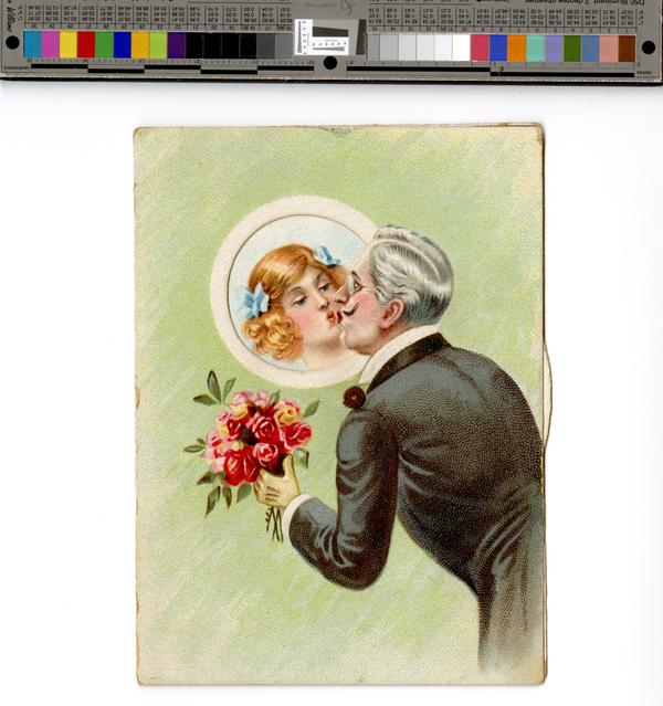 Racist and sexist metamorphic trade card showing an older man in a tuxedo, holding a bouquet of roses, and kissing a "rotating"