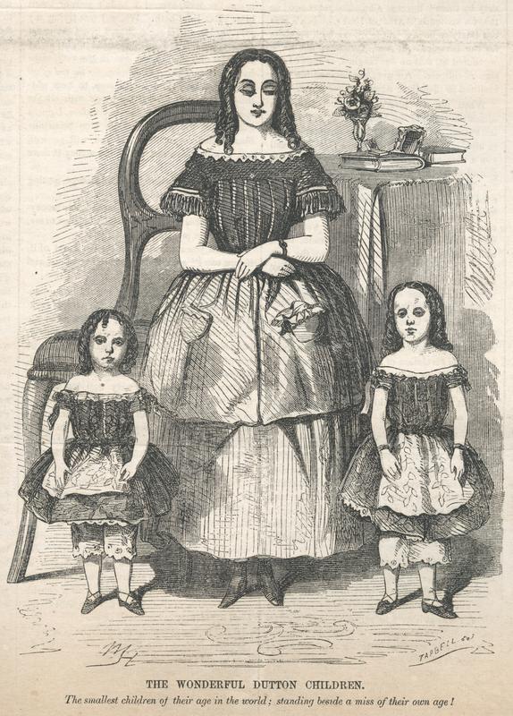 Full-length standing portraits of diminutive Etta and Dollie Dutton, with a significantly taller child standing between them. |