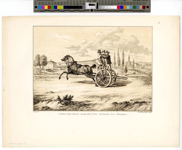 Twelve untitled proofs of prints for the 1856 children’s moral instruction book “City Sights for Country Eyes” depicting scenes of daily urban life, particularly men at work. Professions include draymen, oyster seller, ice carter, rag tender, wagoner, express man, butcher, and baker. All the views show a horse-drawn vehicle, including drays, carts, and wagons. Cityscape, including storefronts, warehouses, and wharves are visible in the background of many of the prints. Scenes also include street and pedestrian traffic (men and women); dogs running by; lamp posts; trees, some in cages; and docked and sailing ships.