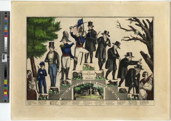 Allegorical print containing a portrayal of a male figure aging from a baby to an older man on a pedestal of life. Includes rhymed couplets describing each age below the image corresponding to animal vignettes adorning the pedestal styled as up and down steps. Shows the figure, in the far left, as an infant as a "lamb like innocent" in the lap of his mother, her long dark hair loose down her back, and attired in a red dress; at the age of 10 with dark hair and attired in a blue pant suit and cap and holding a stick and hoop as he "goat like skips and joys"; at the age of 20 attired in a black top hat, black waistcoat, and blue striped pants when "love doth swell his veins and heifer like untamed remains"; at the age of 30 attired in a military uniform "with bull like strength he smites his foes"; at the age of 40 attired in a military uniform holding a sword and flag and "naught his courage quails but lion like by force prevails"; at the age of 50 with greying hair, attired in a black suit and top hat, and his "strength fails but with wit fox like he helps to manage it"; at the age of 60 with long white hair, attired in a black suit and top hat, and holding out a cane while "wolf like he tries his wealth to raise"; at the age of 70 with rounded shoulders and attired in a black long coat and top hat and cane in hand, "he'll hear and tell but dog like loves at home to dwell"; at the age of 80 slightly hunched and reaching out as "a cat keeps house and loves the fire" he has the same desire; at the age of 90, in the far right, severely hunched over and reliant on a cane that he must suffer everywhere as "weak asses backs were made to bare"; and at the age of 100, attired in a white night gown, seated in a chaise lounge, and tended by a young woman, attired in a red dress and holding a cup as "the sick of life the grave he fears."