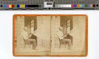 Stereograph depicting “Uncle Jimmie,” an older African American man knitting the corner edge of a mesh fishing net extended out in front of him from a pole on the porch of a wood cabin. Shows the man, with receding, short, cropped hair, seated, and in profile. He wears a white, long-sleeve, button-down shirt; dark-colored pants; and work shoes. The man, possibly Gullah, uses a flat rule and needle on the edge of the net. Behind the man, in the background, an open door to an entryway with an open window is visible. A vertical beam is also visible in the left of the image. Knitting fish net was and is one of a number of Gullah traditions (customs developed by enslaved Africans living along the Atlantic coast of South Carolina) practiced in Beaufort, S.C.