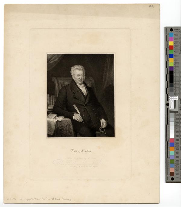 Three-quarter length portrait of the British deacon, abolitionist, and author. Clarkson, attired in a white collared shirt, a black waistcoat, jacket, and pants, sits holding a pair of spectacles in his left hand and a quill in his right hand. He leans his right elbow on a table adorned with a "Map of Africa." Clarkson, author of "The History of the rise, progress, and accomplishment of the African slave-trade," was a founder of the British Anti-Slavery Society.