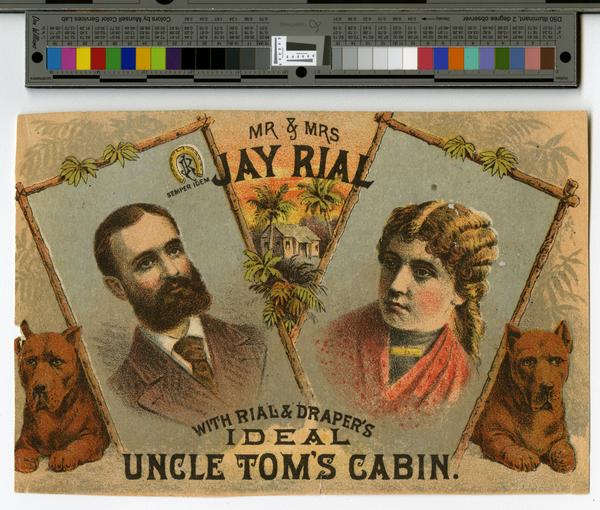 Vignette from an advertisement for the touring stage company's production of "Uncle Tom's Cabin." Contains bust-length portraits of Jay Rial, wearing a beard and attired in a white collared shirt, a brown tie, and brown jacket, and Louise Rial, wearing her hair in curls and attired in a black dress with a gold brooch and a red shawl. Also depicted are brown dogs in recline flanking the portraits of the Rials, a miniature view of a plantation house, and palm leaves. Jay Rial, a New York theatrical manager, began tours of his production of "Uncle Tom's Cabin" circa 1881. The production was associated with novel features of live dogs and donkeys and props, such as floating cakes of ice, and was purported to have earned $1,000,000 by the end of its run. The Rials divorced in 1897.