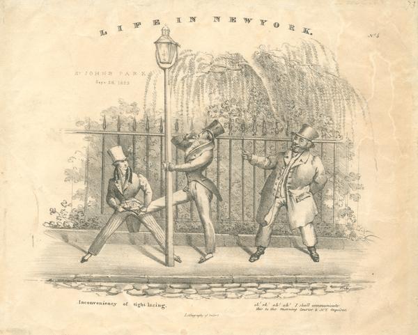 Caricature satirizing early 19th-century, middle-class men’s fashion, specifically male corsets. Depicts a scene in front of a fence at New York's “St. John’s Park” where a white dandy dressed in a top hat, ruffled shirt, and slip on shoes holds onto a lamp post, his right leg up, outstretched, and held by a dandy man companion. He holds his head back and his right hand toward his mouth. The friend, similarly attired in a top hat, waistcoat, and stiped pants crouches with his legs apart. Both are unable to bend. A "practically" attired, older man wearing an overcoat, vest, pants, and boots stands to the right and observes the scene. He states that he will report the event to the "Morning Courier & N.Y. Enquirer." Scene also shows dense foliage and a tree in the park behind the fence.