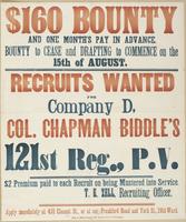 $160 bounty and one month's pay in advance. : Bounty to cease and drafting to commence on the 15th of August. Recruits wanted for Company D, Col. Chapman Biddle's 121st Reg., P.V. $2 premium paid to each recruit on being mustered into service. / T.E. Zell, recruiting officer. Apply immediately at 431 Chestnut St., or at cor. Frankford Road and York St., 19th Ward.