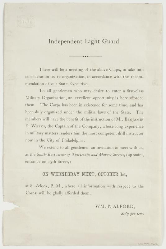 Independent Light Guard. : There will be a meeting of the above corps, to take into consideration its re-organization, in accordance with the recommendation of our state executive. To all gentlemen who may desire to enter a first-class military organization, an excellent opportunity is here afforded them. The corps has been in existence for some time, and has been duly organized under the militia laws of the state. The members will have the benefit of the instruction of Mr. Benjamin F. Weeks, the captain of the company, whose long experience in military matters renders him the most competent drill instructor now in the city of Philadelphia. We extend to all gentlemen an invitation to meet with us, at the south-east corner of Thirteenth and Market Streets, (up stairs, entrance on 13th Street,) on Wednesday next, October 1st, at 8 o'clock, p.m., where all information with respect to the corps, will be gladly afforded them. / Wm. P. Alford, sec'r pro tem.