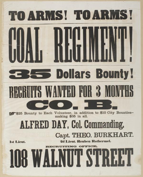 To arms! To arms! Coal Regiment! : 35 dollars bounty! Recruits wanted for 3 months Co. B. $25 bounty to each volunteer, in addition to $10 city bounties--making $35 in all. Alfred Day, Col. commanding. / Capt. Theo. Burkhart. 1st Lieut. [blank] 2d Lieut. Reuben Rothermel. Recruiting office, 108 Walnut Street.