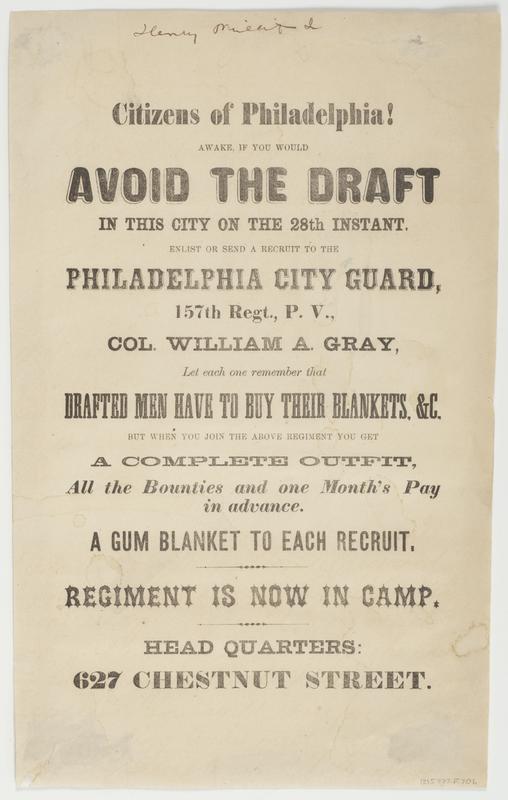 Citizens of Philadelphia! : Awake, if you would avoid the draft in this city on the 28th instant. Enlist or send a recruit to the Philadelphia City Guard, 157th Regt., P.V., Col. William A. Gray, let each one remember that drafted men have to buy their blankets, &c. but when you join the above regiment you get a complete outfit, all the bounties and one month's pay in advance. A gum blanket to each recruit. Regiment is now in camp. Head quarters: 627 Chestnut Street.