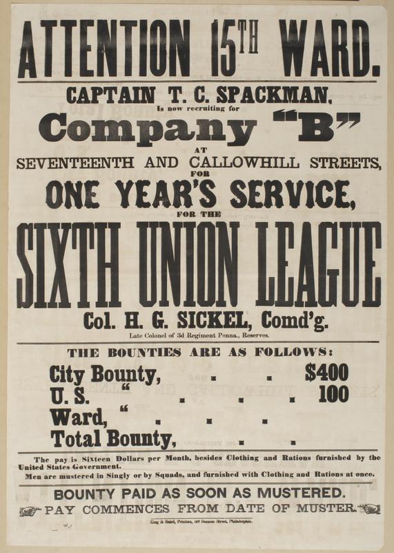 Attention 15th Ward. : Captain T.C. Spackman, is now recruiting for Company "B" at Seventeenth and Callowhill Streets, for one year's service for the Sixth Union League Col. H.G. Sickel, comd'g. late colonel of the 3d Regiment Penna., Reserves. ... The pay is sixteen dollars per month, besides clothing and rations furnished by the United States government. Men are mustered in singly, or by squads, and furnished with clothing and rations at once. Bounty paid as soon as mustered. Pay commences from date of muster.