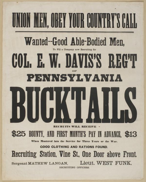 Union men, obey your country's call : Wanted--good able-bodied men, to fill a company now recruiting for Col. E.W. Davis's reg't Pennsylvania Bucktails Recruits will receive $25 bounty, and first month's pay in advance, $13 when mustered into the service for three years or the war. Good clothing and rations found. Recruiting station, Vine St., one door above front. / Sergeant Mathew Landan, Lieut. West Funk, recruiting officers.
