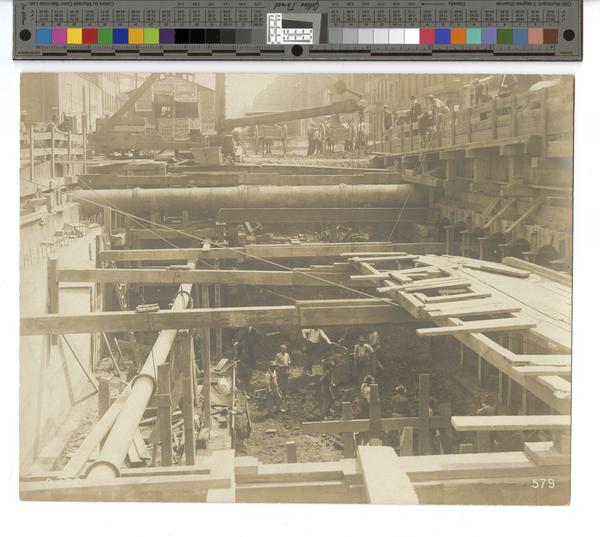 View showing street construction by the Philadelphia Rapid Transit Company of the Market Street Subway in a large, deep pit on the 2100 block of Market Street. The construction workers include white and African American men. Shows men spectators looking down at the pit. Men fill horse-drawn carts with dirt, and theater advertisements for the "Famous Ithaca Band" at Willow Grove Park adorn construction equipment.