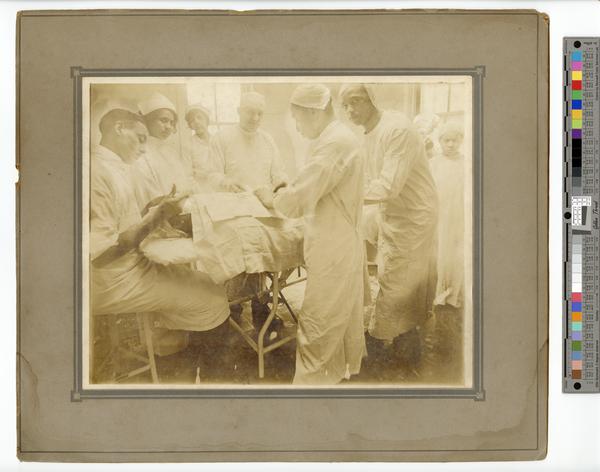 [View of operating room with Dr. J.H. Mudgett and African American men physicians and African American women nurses at a surgical