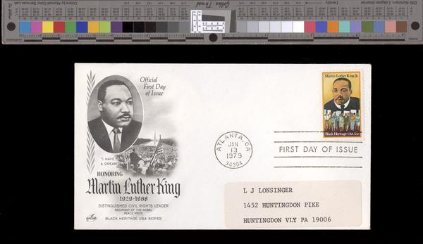 Contains ink-stamp postmark: Atlanta, GA Jan 13 1979 3030A and cancelled "First Day of Issue" Black Heritage USA color-printed 15-cent stamp after the design of Jerry Pinkney and depicting a portrait of Martin Luther King, Jr. and an inset of a view of King and several men and women walking at a protest march. The King stamp issued in 1979, was the second issued for the Black Heritage Series begun in 1978 by the U.S. Postal Service to recognize "the contribution of Black Americans to the growth and development of the United States."